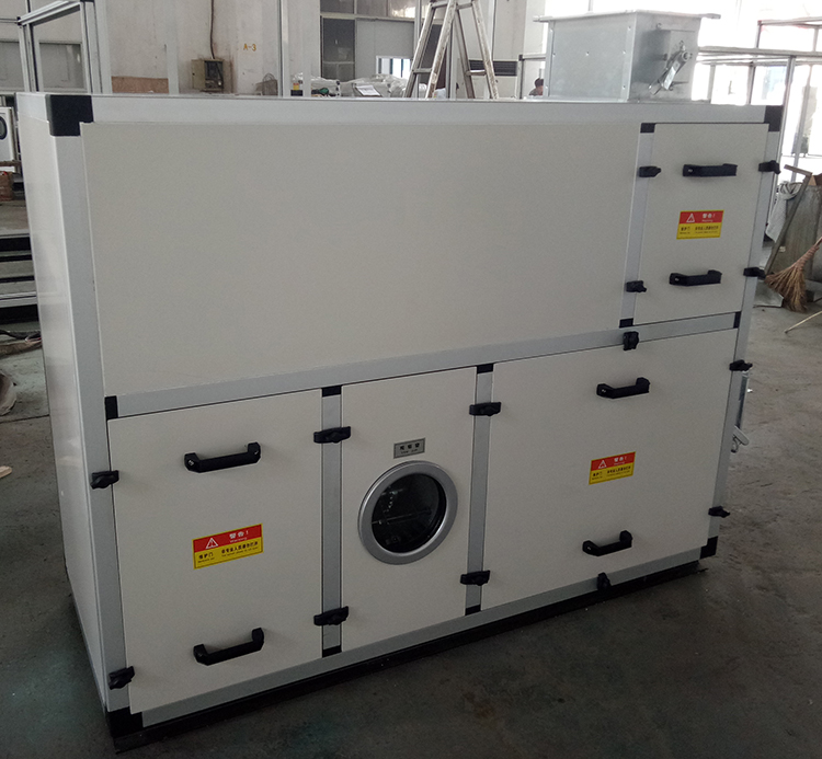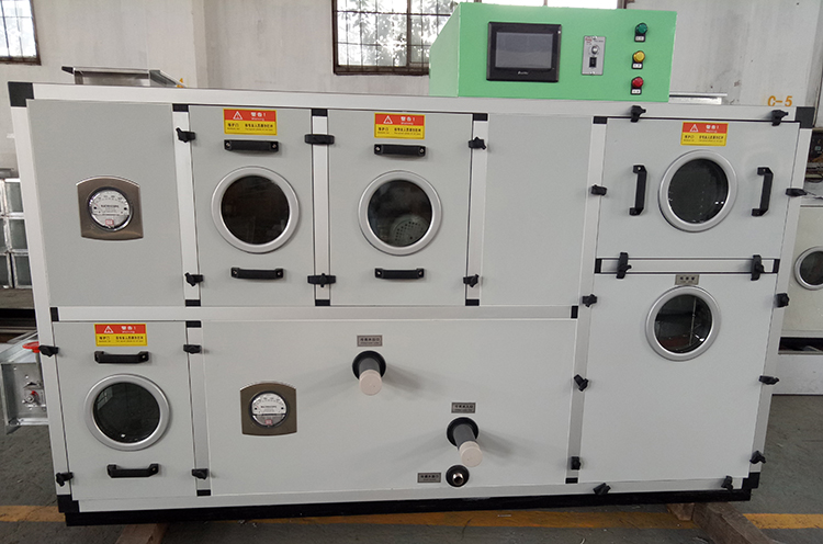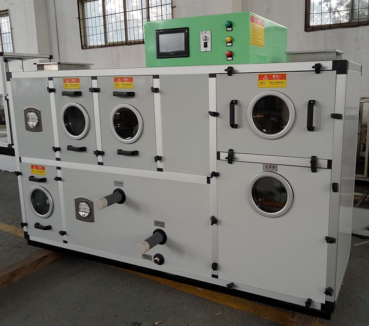 KZHS-350D-500L药品转轮除湿空调机组系转轮除湿与冷冻除湿匹配组合而成。通过对机组处理进风降温减湿,再经转轮深层次除湿后,其处理空气abs含湿量达到设计要求,再经过后级表冷降温到设计温度值,使机组出风温度、相对湿度均能符合用户要求,达到常温低湿的除湿结果。