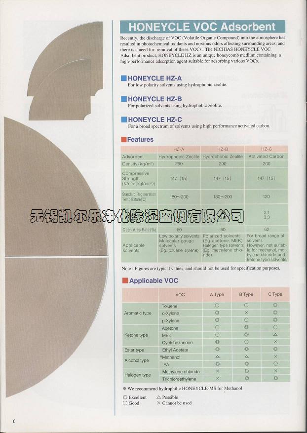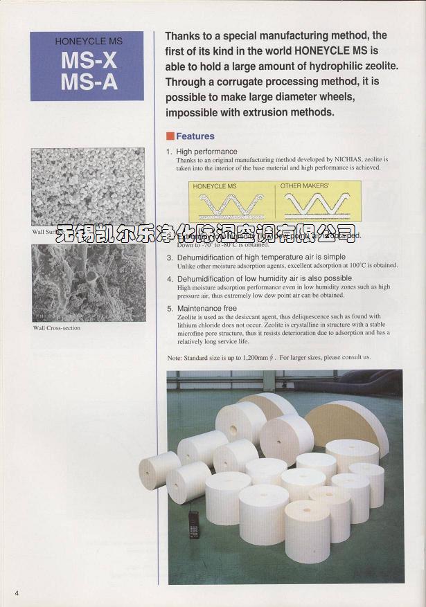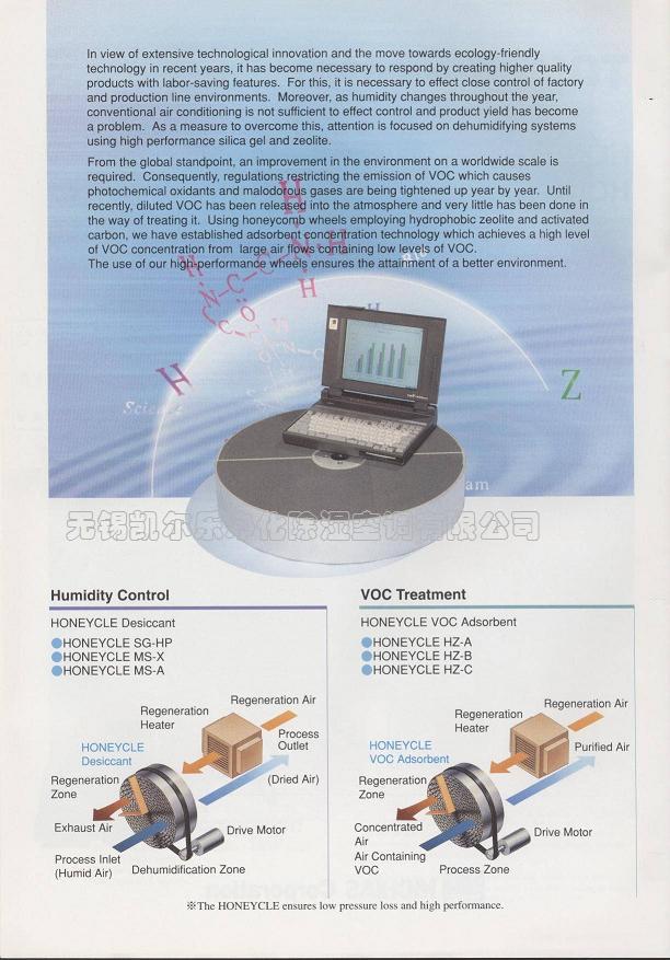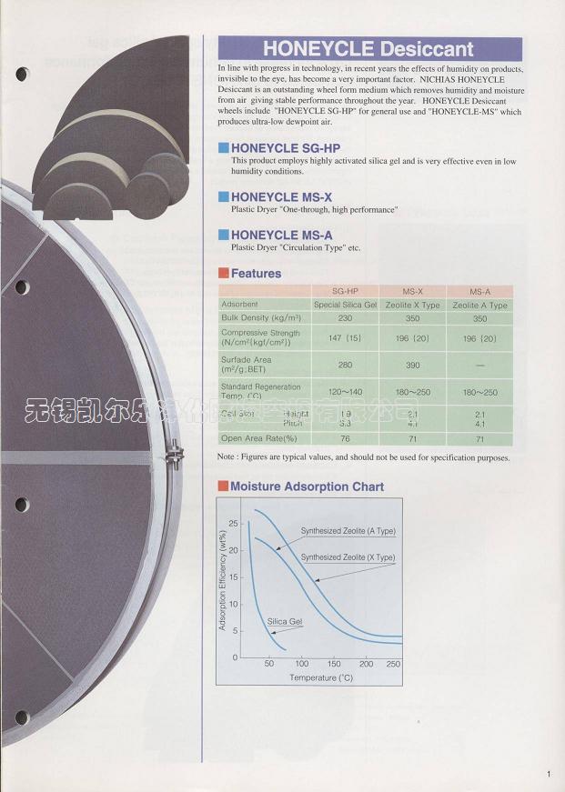 日本NICHIAS株式会社成立到今100年主要从事汽车、建筑、耐火及除湿轮等原材料生产公司。日本NICHIAS株式会社的蜂窝式转轮采用采用无机陶瓷纤维材料加陶土原料,经圆盘状成型、烧结、矽胶原溶液结晶反应成本吸湿的除湿转轮,吸湿溶液可根据吸湿能力采用陶瓷、沸石等年营业额10亿美金。