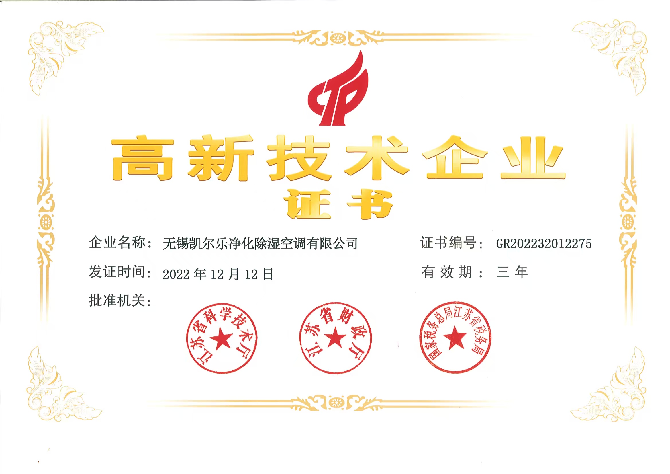 2022年12月12日无锡凯尔乐净化除湿空调有限公司认定为高新技术企业,证书编号:GR202232012275